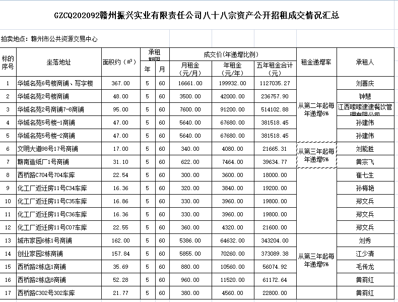 2020年11月25日上午10時,在贛州市公共資源交易中心舉行的贛州振興實業(yè)有限責任公司八十八宗資產公開招租(項目編號:GZCQ202092),現將公開招租成交情況公示如下: