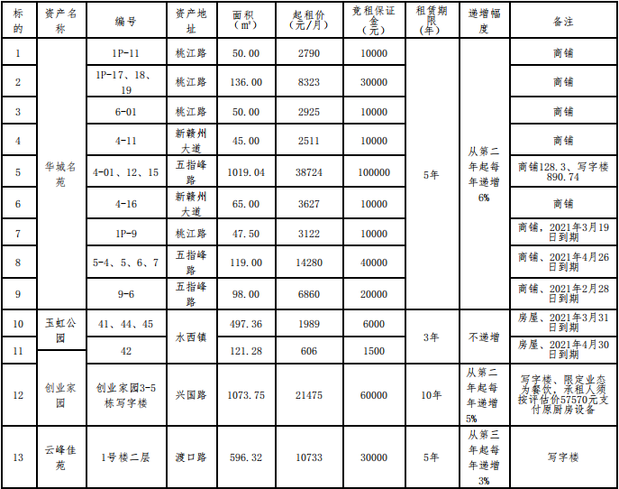 贛州振興實(shí)業(yè)有限責(zé)任公司委托江西江南拍賣有限公司,定于2021年5月28日14:30開(kāi)始在贛州市公共資源交易中心(長(zhǎng)征大道9號(hào))進(jìn)行國(guó)有資產(chǎn)公開(kāi)招租,現(xiàn)歡迎符合條件的單位或個(gè)人前來(lái)報(bào)名參加競(jìng)租。